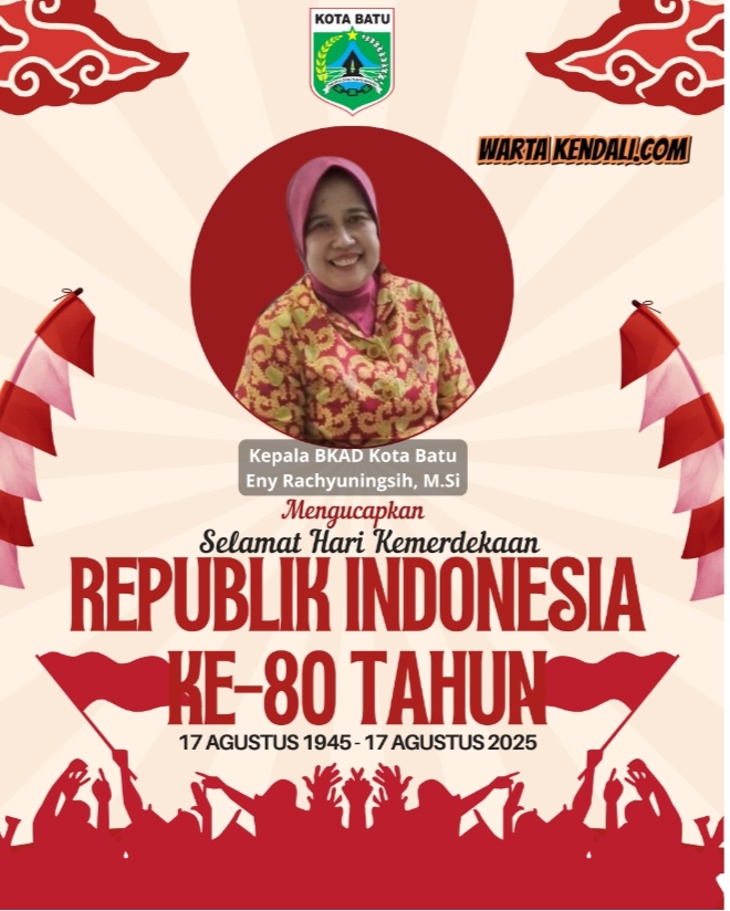 WARTAKENDALI.com | Dinas (BKAD), Kota Batu – HUT RI ke-80 Tahun 2025. Mari kita rawat persatuan dan teruskan perjuangan, demi Indonesia yang lebih kuat, adil, dan makmur. Indonesia untuk Selamanya, semoga kemerdekaan ini menjadi sumber semangat untuk membangun negeri yang maju. Salam Cinta untuk Indonesia, semoga bangsa ini selalu disinari persatuan dan semangat gotong royong. Jayalah Indonesiaku Tercinta, semoga masa depan bangsa ini penuh dengan keberkahan dan kemajuan.
