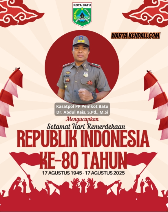 WARTAKENDALI.com | Dinas Satpol PP, Kota Batu – HUT RI ke-80 Tahun 2025. Mari kita rawat persatuan dan teruskan perjuangan, demi Indonesia yang lebih kuat, adil, dan makmur. Indonesia untuk Selamanya, semoga kemerdekaan ini menjadi sumber semangat untuk membangun negeri yang maju. Salam Cinta untuk Indonesia, semoga bangsa ini selalu disinari persatuan dan semangat gotong royong. Jayalah Indonesiaku Tercinta, semoga masa depan bangsa ini penuh dengan keberkahan dan kemajuan.