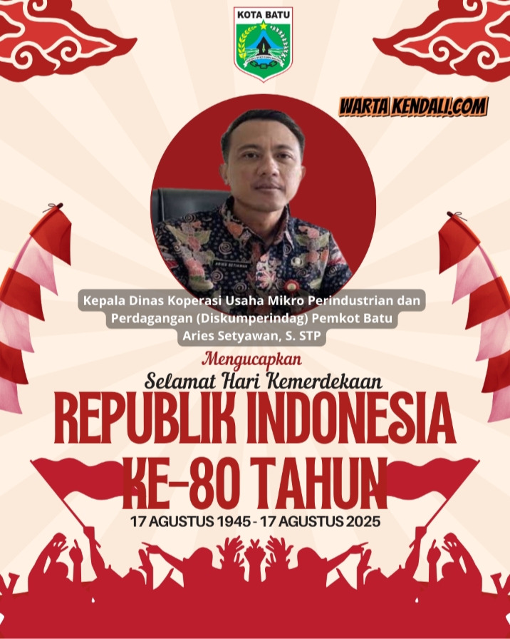WARTAKENDALI.com | Diskumperindag, Kota Batu – HUT RI ke-80 Tahun 2025. Mari kita rawat persatuan dan teruskan perjuangan, demi Indonesia yang lebih kuat, adil, dan makmur. Indonesia untuk Selamanya, semoga kemerdekaan ini menjadi sumber semangat untuk membangun negeri yang maju. Salam Cinta untuk Indonesia, semoga bangsa ini selalu disinari persatuan dan semangat gotong royong. Jayalah Indonesiaku Tercinta, semoga masa depan bangsa ini penuh dengan keberkahan dan kemajuan.