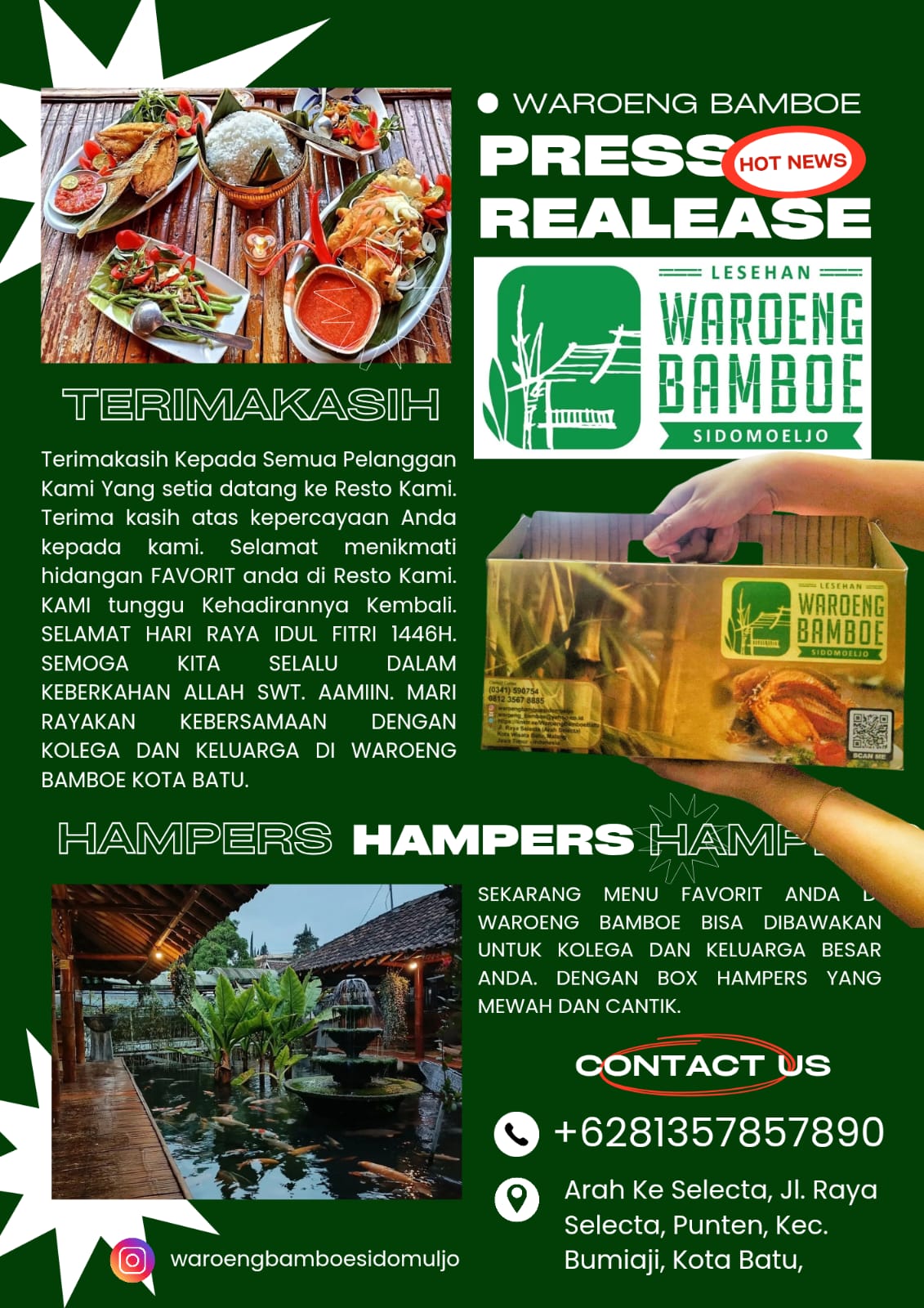 Selamat Hari Raya IDUL FITRI 1446 H. Semoga kita selalu dalam keberkahan ALLAH SWT. AAMIIN. Mari rayakan kebersamaan dengan kolega dan keluarga di WAROENG BAMBOE Kota Batu.