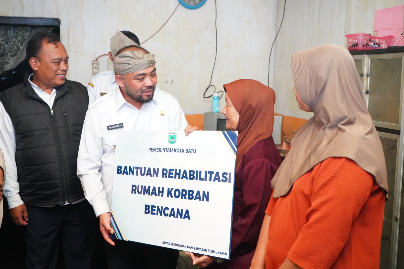 Selain itu, Wakil Wali Kota Batu juga menyerahkan secara simbolis bantuan bedah rumah untuk korban bencana, yang diterima langsung oleh ibu Ngatinah bersama anak menantunya.