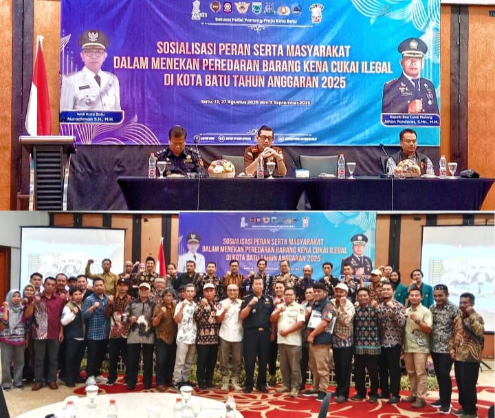 WARTAKENDALI.com | Kota Batu – Untuk menekan dan mencegah Peredaran rokok ilegal, maka Bea Cukai Malang bekerjasama dengan Kejaksaan Negri Batu dan Satuan Polisi Pamong Praja Kota Batu menggelar sosialisasi tentang larangan rokok ilegal, kegiatan tersebut Bertempat di eL Hotel, Jalan Panglima Sudirman, Kota Batu, Kecamatan Batu, Pada Rabu, (13/8/ 2025).