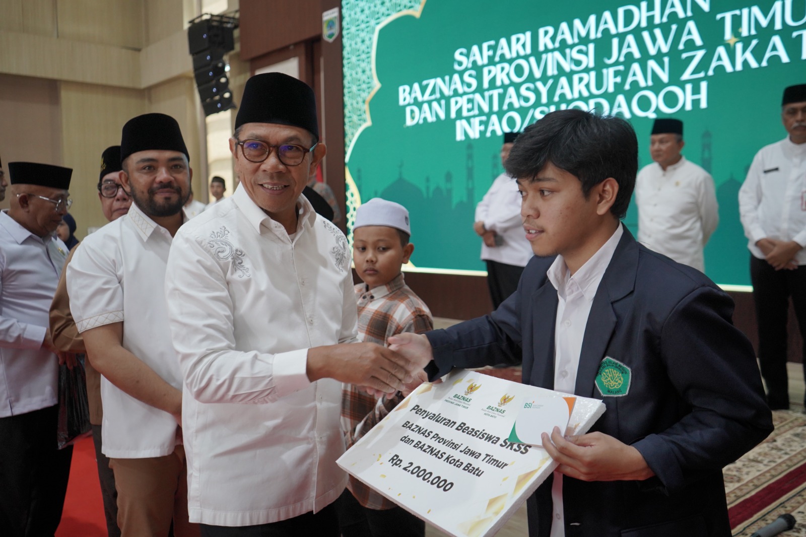 WARTAKENDALI | Kota Batu – Badan Amil Zakat Nasional (Baznas) Provinsi Jawa Timur menggelar kegiatan Safari Ramadan dan Pentasyarufan Zakat, Infaq, Shodaqoh di Graha Pancasila, Balai Kota Among Tani, Jalan Panglima Sudirman No.507, Desa Pesanggrahan,Kecamatan Batu, Kota Batu, Jawa Timur, pada Rabu (5/3/2025). Dalam kegiatan ini adalah salah satu dari rangkaian acara Safari Ramadan yang merupakan kolaborasi antara Baznas Provinsi Jatim dengan Baznas Kota Batu.
